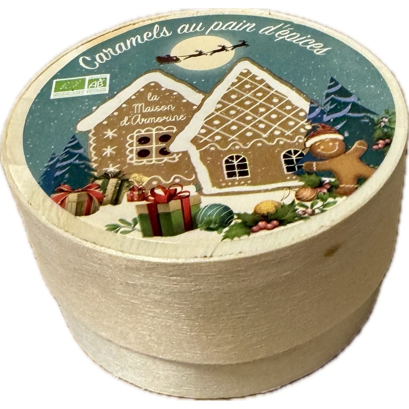 Petits caramels bio pain d'épices : recette traditionnelle au beurre frais de Bretagne et à la fleur de sel de Guérande, relevée des épices typiques du pain d'épice. Confectionnés à Quiberon. Emballages individuels compostables. Boîte en bois 50g.