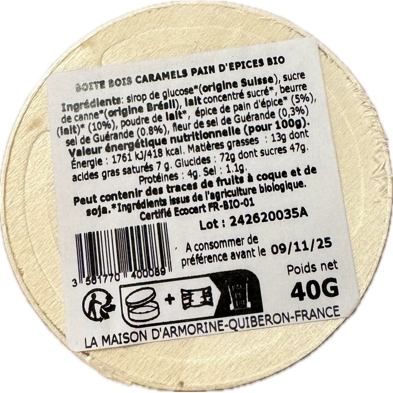 Sirop de glucose*, sucre de canne*, lait concentré sucré*, beurre (lait)* (10%), poudre de lait*, épices de pain d'épice (5%), sel de Guérande, fleur de sel de Guérande