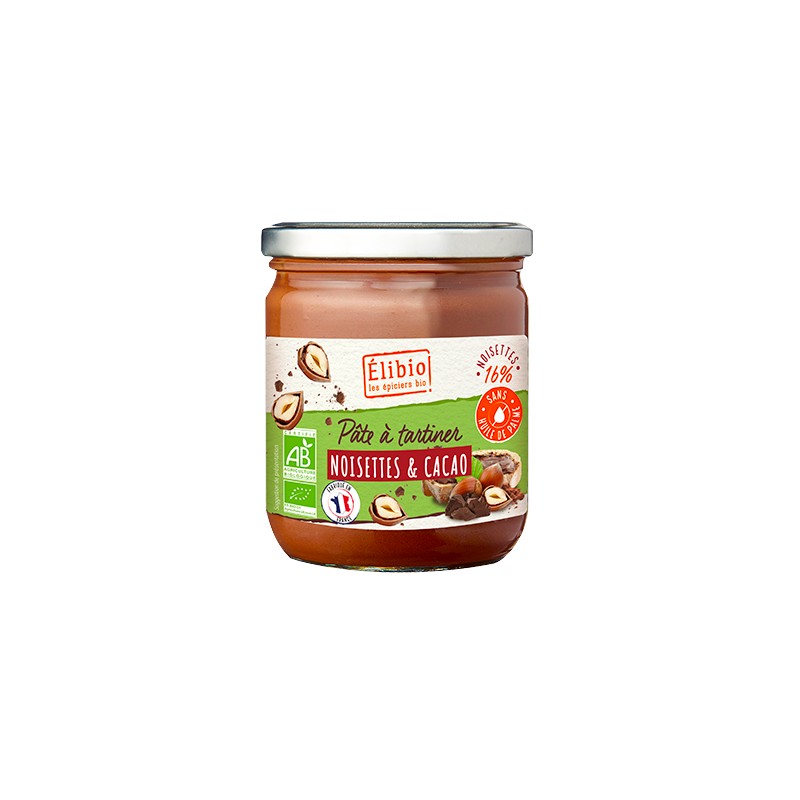 Venez découvrir Le Pâte à Tartiner Noisettes et Cacao de la marque Elibio, idéal pour un petit déjeuner et un goûter savoureux.