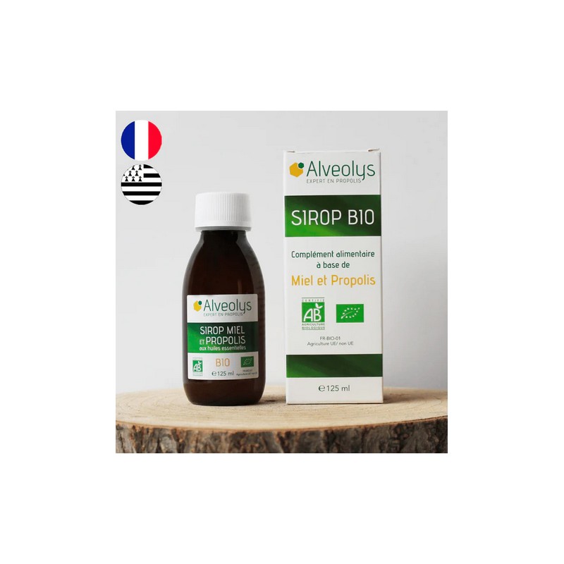 Miel toute fleur * (12,75 g), sirop d’agave* (12,75 g), jus de citron* (0,783 g), teinture de propolis* (0,675 g). Huile essentielle d'eucalyptus radiée* (0,0135 g), thym rouge thymol* (arôme). Alcool (3,70 % V/V).