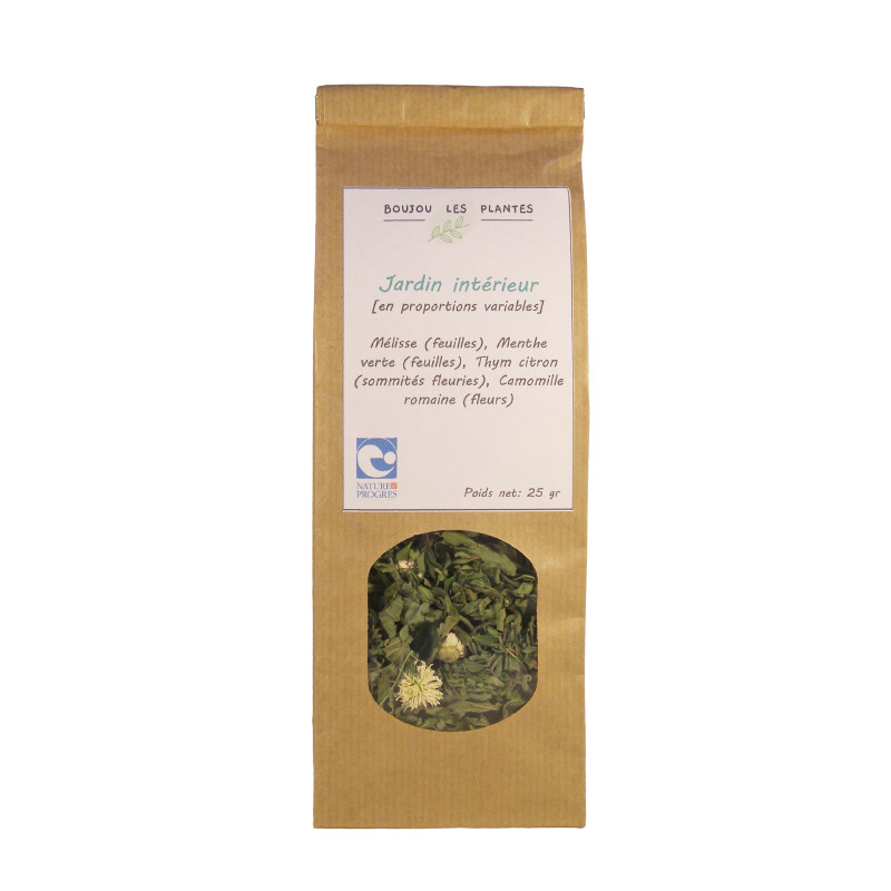 Mélisse (feuilles), menthe verte (feuilles), thym citron (sommités fleuries), camomille romaine (fleurs).